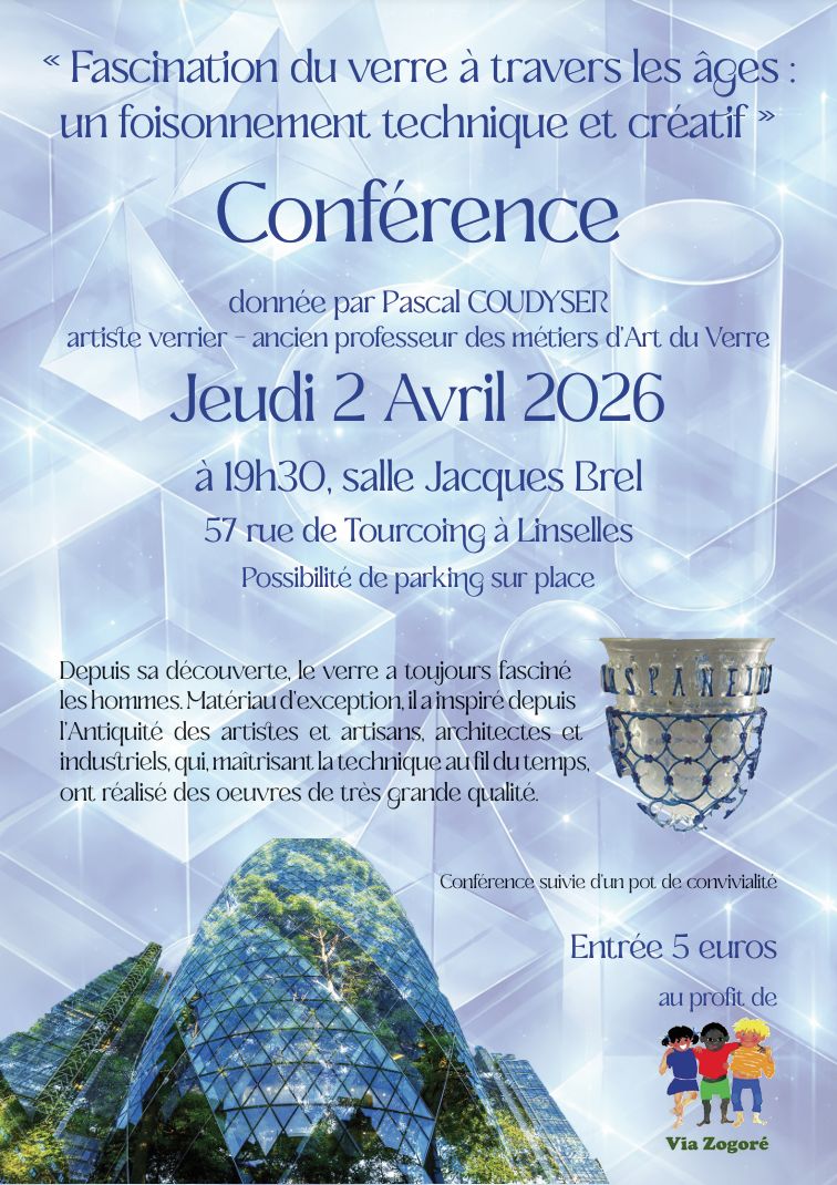 L'association Via Zogoré organise une conférence passionnante consacrée à la fascination du verre à travers les âges à Linselles, salle Jacques Brel, le jeudi 02 avril 2026 à 19h30.